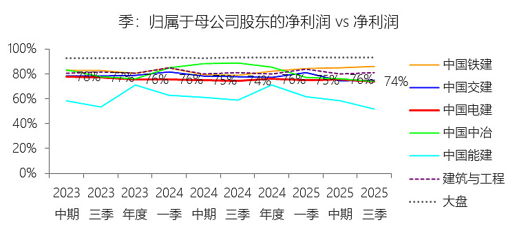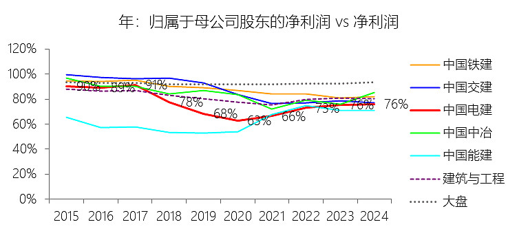 归属于母公司股东的净利润:2025年前三季,中国电建的归属于母公司股东的净利润为74.74亿元,同比减少14.86%,与净利润的比例为73.91%,同比下降0.52个百分点;2015-2024年(十年),此项合计为886.07亿元,平均比例为74.91%,比建筑与工程行业的均值低6.2个百分点,长期呈下降趋势。比例短期下降主要由于:根据2025年第三季度报告,公司在利润总额下降10.52%的情况下,所得税费用却逆势上升(由去年同期的23.01亿元增至24.99亿元),导致净利润空间被显著压缩;同时,三季度归母净利润的降幅(14.86%)大于少数股东损益的降幅(约12.5%),这主要受到非流动资产处置损益较去年同期大幅减少(减少约6.9亿元)等非经常性项目波动的集中影响,且这些损失主要体现在母公司报表层面。比例长期下降主要由于:公司近年来大力推行“投建营一体化”战略,在新能源、抽水蓄能及大水务等重资产投资领域广泛引入社会资本和产业基金,成立了大量的项目公司(SPV),这种模式导致少数股东在项目盈利中所占的份额随业务规模扩张而持续攀升,形成了对归母净利润比例的长期稀释。比例低于建筑与工程行业的均值主要由于:中国电建并非单纯的工程承包商,而是深度参与能源与基础设施投资的综合服务商,其持有的PPP及BOT项目股权结构比传统建筑企业更为多元化,项目层级的利润分流效应显著,加之近年来为平衡资产负债率而进行的股权融资和引战增资,使得公司在保持营收增长的同时,归母利润的留存占比 结构性地低于行业平均水平。