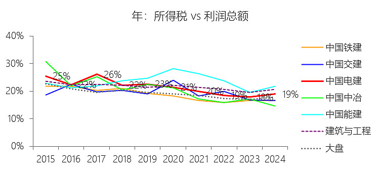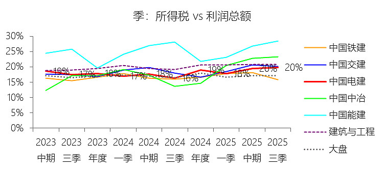 所得税率:2025年前三季,中国电建的所得税为25.00亿元,同比增长8.63%,与利润总额的比例为19.82%(所得税率),同比上升3.5个百分点;2015-2024年(十年),此项合计为311.21亿元,平均比例为20.83%,比建筑与工程行业的均值低0.6个百分点,长期呈下降趋势。