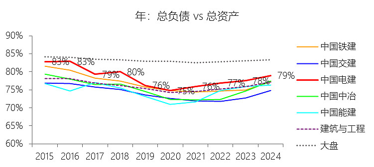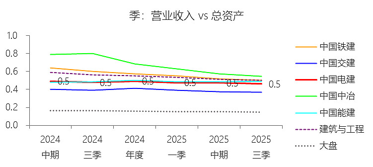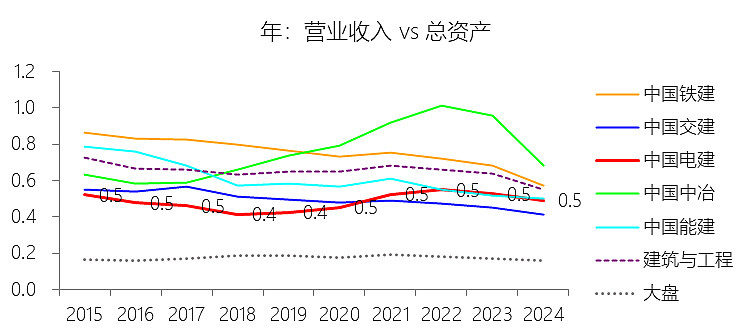 总资产增长率:2025年第三季末,中国电建的总资产为14042.93亿元,对比年初增长8.94%,增速同比下降2.57个百分点;2015-2024年(九年)增长218.19%,年复合增长13.72%,比建筑与工程行业的复合增速高0.84个百分点,长期呈下降趋势。增速短期下降主要由于:根据2025年第三季度报告,公司在建工程规模较年初显著收缩,由734.56亿元降至651.91亿元,降幅达11.25%,反映出大量项目在完工结转后,新开工项目的投资强度受宏观基建增速放缓及内部投资结构优化影响有所放缓;同时,公司为改善财务质量,严格落实“一利五率”考核并强化资产负债率管控,加大了对非主业及低效资产的清理力度,如投资性房地产等科目资产规模明显下降,导致总资产边际增速在万亿高基数上有所回落。增速长期下降主要由于:随着中国电建资产规模跨入万亿门槛,基数效应使得维持两位数的高速增长难度增大;且公司在2022年剥离了资产占比较高的房地产业务,全面转向以能源电力为核心的主业发展模式,加之国资监管对央企去杠杆、控规模、防风险的要求持续收紧,企业增长逻辑已从早期的“粗放式规模扩张”切换至“高质量平稳增长”阶段。增速高于建筑与工程行业的复合增速主要由于:公司深度契合国家“双碳”战略及新型电力系统建设需求,在水利水电、抽水蓄能及新能源工程等高景气赛道拥有极强的市场垄断地位和技术壁垒;其长期推行的“投建营一体化”模式,通过资本金注入带动大规模 EPC 工程及特许经营权的资产获取,使其在产业链中具备比传统房建企业更强的资源整合能力与资产吸纳潜能。