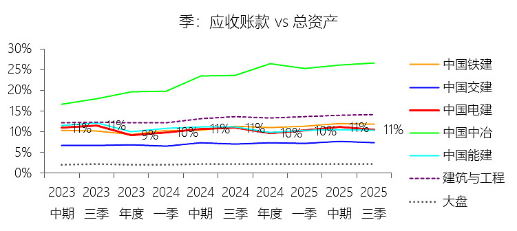 应收账款:2025年第三季末,中国电建的应收账款为1481.91亿元,对比年初增长17.7%,与总资产的比例为10.55%,同比下降0.4个百分点;2015-2024年(十年),此项合计为6990.24亿元,平均比例为8.26%,比建筑与工程行业的均值低4.34个百分点,长期呈上升趋势。比例短期下降主要由于:公司正深度推进“投建营一体化”转型,大量资金投入新能源及抽水蓄能等重资产项目,导致总资产规模(如固定资产和合同资产)的扩张速度超过了应收账款的增长速度,产生了显著的“分母效应” ;同时,在外部宏观环境严峻的背景下,公司强化了对“两金”(应收账款和存货/合同资产)的集中管控与清欠力度,提升了回款质量。比例长期上升主要由于:过去十年间公司业务结构从传统的水电EPC工程向大规模城市基础设施及清洁能源投资领域转型,此类项目建设周期长、结算链条复杂,且受地方政府支付能力及宏观经济去杠杆影响,行业普遍面临结算周期延长和回款放缓的挑战。比例低于建筑与工程行业的均值主要由于:中国电建拥有庞大的特许经营及能源营运资产(如长期持有并运行的水电站、风电场等),这些资产在报表中体现为金额巨大的无形资产或固定资产,从而显著拉大了总资产基数;此外,公司还拥有实力雄厚的电力规划设计业务,该板块属于高附加值的咨询服务,其应收账款密度天然低于传统的房屋建筑和交通基础设施承包业务。
