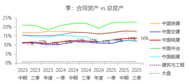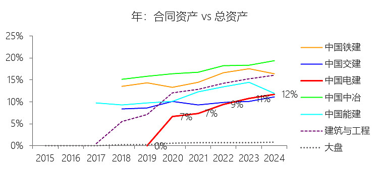 合同资产:2025年第三季末,中国电建的合同资产为1934.13亿元,对比年初增长28.15%,与总资产的比例为13.77%,同比上升1.46个百分点;2015-2024年(十年),此项合计为5121.49亿元,平均比例为6.06%,比建筑与工程行业的均值低4.3个百分点,长期呈上升趋势。比例短期上升主要由于:根据2025年第三季度报告,公司合同资产余额较年初大幅增长28.15%至1934.13亿元,增速显著高于8.94%的总资产增速 ;这主要源于公司在手订单充足且处于建设高峰期,随工程进度确认的产值规模扩大,但受项目结算周期性因素及部分投建营项目里程碑节点未到影响,已完工未结算款项在总资产中的占比被动抬升 。比例长期上升主要由于:随着新收入准则的全面实施,建筑行业普遍将原“存货”科目下的已完工未结算款重分类至“合同资产”科目,且中国电建近年来向新能源、水环境治理等长周期、大规模工程转型,此类项目结算链条较长,导致合同资产随业务规模扩张呈长期增长态势。比例低于建筑与工程行业的均值主要由于:中国电建具有明显的“能源运营”重资产特征,其资产负债表中包含大量由抽水蓄能、风电及太阳能发电等运营业务形成的固定资产(1639.85亿元)和无形资产(2799.79亿元);这种庞大的非流动资产基数(总计7955.87亿元)极大地拉高了总资产分母(1.4万亿元),从而使合同资产的相对比例在与纯工程承包类企业对比时显得较低 。