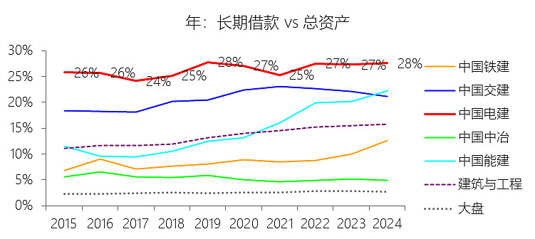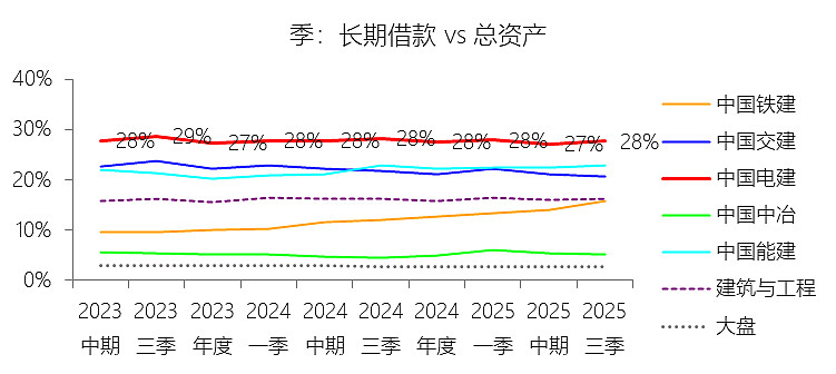 长期借款:2025年第三季末,中国电建的长期借款为3881.40亿元,对比年初增长9.16%,与总资产的比例为27.64%,同比下降0.56个百分点;2015-2024年(十年),此项合计为22477.09亿元,平均比例为26.57%,比建筑与工程行业的均值高12.56个百分点,长期呈上升趋势。