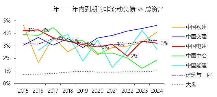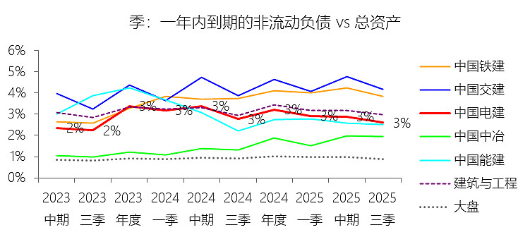 一年内到期的非流动负债:2025年第三季末,中国电建的一年内到期的非流动负债为364.55亿元,对比年初减少12.24%,与总资产的比例为2.60%,同比下降0.17个百分点;2015-2024年(十年),此项合计为2716.99亿元,平均比例为3.21%,比建筑与工程行业的均值低0.05个百分点,长期呈下降趋势。