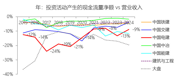 经营活动产生的现金流量净额:2025年前三季,中国电建的经营活动产生的现金流量净额为-370.32亿元,绝对值同比减少21.06%,与营业收入的比例为-8.43%,同比上升2.58个百分点;2015-2024年(十年),此项合计为2158.14亿元,平均比例为5.21%,比建筑与工程行业的均值高2.71个百分点,长期呈下降趋势。比例短期上升主要由于:根据2025年第三季度报告,公司在营业收入仅增长3.05%的情况下,销售商品、提供劳务收到的现金同比大幅增长约9.8%(由4226.11亿元增至4640.33亿元),显示出公司加大了工程回款力度,收现比显著改善;同时,支付其他与经营活动有关的现金减少了约73.86亿元,有效缩减了经营性现金流出的敞口,使得现金流量净额的亏损额度明显收窄。比例长期下降主要由于:公司业务模式从传统的纯施工承包向“投建营一体化”转型,大量PPP及特许经营权项目进入建设高峰期,导致前期材料、人工及项目分包的刚性现金支出规模庞大;同时,受宏观经济环境及地方财政压力影响,下游客户的结算与支付周期有所拉长,应收账款及合同资产对经营性现金流的占用呈趋势性增加。比例高于建筑与工程行业的均值主要由于:中国电建拥有极高比例的勘测设计咨询业务,该业务处于产业链顶端,具有轻资产、高毛利及现金流回笼快等特征,其利润含金量高于传统房建及路桥工程;此外,公司在水电及抽水蓄能等核心领域具备近乎垄断的地位,较强的议价能力和在能源行业深厚的基础,使其在项目结算和资金回笼方面相比一般建筑企业具备更强的优势。