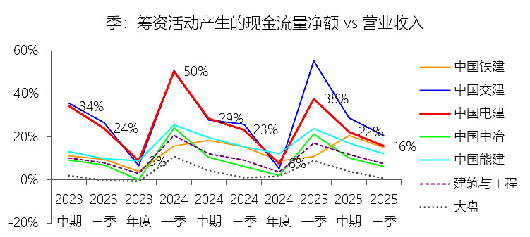筹资活动产生的现金流量净额:2025年前三季,中国电建的筹资活动产生的现金流量净额为690.21亿元,同比减少31%,与营业收入的比例为15.72%,同比下降7.76个百分点;2015-2024年(十年),此项合计为3819.01亿元,平均比例为9.23%,比建筑与工程行业的均值高5.54个百分点,长期呈下降趋势。比例短期下降主要由于:根据2025年第三季度报告,公司筹资活动现金流入同比减少约3.92%(主要受吸收投资收到的现金减少影响),而筹资活动现金流出却同比大幅增加13.41%(由2200.56亿元增至2495.69亿元),其中偿还债务支付的现金高达2218.42亿元,同比增加约255亿元,反映出公司在当期面临较大的债务到期偿付压力,且通过权益融资及长期借款获取的净增量资金因宏观杠杆管控及融资节奏优化而有所收缩。比例长期下降主要由于:随着公司经营规模步入平稳增长期,内生性的经营现金流回笼能力逐步增强,对外部筹资的依赖度有所降低;同时,国家对建筑央企“降杠杆、减负债”的考核要求日益严格,促使公司从“债务驱动型增长”向“资产轻量化”转型,通过公募REITs盘活存量、限制大规模债权融资,导致筹资净额占营收的比重在十年维度内呈趋势性回落。比例高于建筑与工程行业的均值主要由于:中国电建深耕的水利水电及新能源投资业务属于典型的资本密集型产业,相比普通建筑承包商,其“投建营一体化”模式在前期需要匹配大规模的长期借款及项目专项债,以支持抽水蓄能和大型风电光伏基地的建设运营,这种独特的业务属性决定了其在资本市场上的融资强度和频率长期处于行业领先水平。