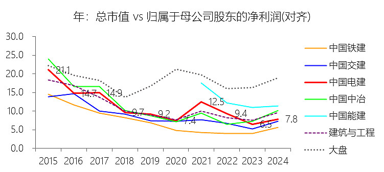 市值增长率:2025年第三季末,中国电建的总市值为961.22亿元,同比减少1.06%,增速同比下降6.48个百分点;2015-2024年(九年)减少14.84%,年复合减少1.77%,比建筑与工程行业的复合增速低1.74个百分点,长期呈上升趋势。增速短期下降主要由于:根据2025年第三季度报告,公司归母净利润同比减少14.86%,这直接拖累了二级市场的价值逻辑,其中非经常性损益因资产处置收益同比减少约6.89亿元而大幅缩水,且在所得税费用上升的压力下,净利润率的波动削弱了投资者的风险偏好;同时,受国内宏观基建投资增速放缓及电力市场化改革导致绿电交易价格预期下行等外部因素影响,市场对重资产基建龙头的估值修复动能有所减弱,导致市值出现小幅回撤。增速长期上升主要由于:公司在2015-2024年间成功实现了从“传统基建承包商”向“全球新能源投建营一体化服务商”的战略转型,特别是在2022年剥离房地产业务并聚焦“双碳”战略后,资本市场对其估值体系进行了重构,从低毛利的施工逻辑转向了具有高壁垒、高成长性的清洁能源运营商逻辑;虽然受2015年股市波动高基数影响十年总额微降,但其在抽水蓄能和新能源EPC领域近乎垄断的地位,以及资产负债结构的持续优化,驱动了其市场价值中枢在转型过程中长期震荡回升。增速低于建筑与工程行业的复合增速主要由于:中国电建所处的能源基建赛道具有极强的重资产属性和长投资周期,前期大规模资本金注入对经营性现金流和利润释放存在显著的滞后效应,相比部分高周转的房建或市政基建企业,其资产周转速度及利润兑现斜率相对平缓;此外,为支撑万亿资产扩张,公司频繁引入战略投资者导致少数股东权益占比长期高企,在归母净利润增速受限的背景下,市值扩张速度受资本稀释及大型项目收益确定的长周期影响,阶段性落后于行业平均水平。