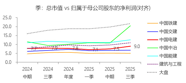 市盈率:2025年Q3 TTM,中国电建的市盈率为9.0倍,同比上升1.03个倍数;2015-2024年(十年),平均市盈率为10.5倍,比建筑与工程行业的均值高0.14个倍数,长期呈下降趋势。市盈率短期上升主要由于:根据2025年第三季度报告,公司归母净利润(TTM)同比大幅减少12.46%,其主要原因在于营业总成本增速(3.84%)快于营业收入增速(3.05%),加之所得税费用上涨及资产处置损益波动削弱了当期盈利;而在业绩承压背景下,公司二级市场市值仅微跌1.06%,这种股价韧性与业绩跌幅的错位导致了市盈率(市值/净利润)倍数的被动抬升。市盈率长期下降主要由于:受宏观基建投资增速放缓及行业估值中枢整体下移影响,建筑类央企普遍经历了一轮从“成长性估值”向“周期性估值”回归的过程;同时,公司在2017年及2023年多次实施大额股权融资以支撑战略转型,股本的显著扩张在短期内稀释了每股收益,在利润释放周期与项目建设周期不完全匹配的情况下,导致市盈率在十年维度内呈震荡下行态势。市盈率高于建筑与工程行业的均值主要由于:公司具备显著的“绿色能源转型”溢价,在抽水蓄能、新能源设计与施工及大型水电站领域拥有极高的技术护城河与市场垄断地位;相比于业务同质化严重的传统路桥或房建企业,中国电建“投建营一体化”模式下的清洁能源资产具有更强的长期确定性与盈利天花板,市场更倾向于将其视为兼具公用事业稳健性与基建成长性的稀缺标的,从而在行业均值基础上给予一定的估值溢价。