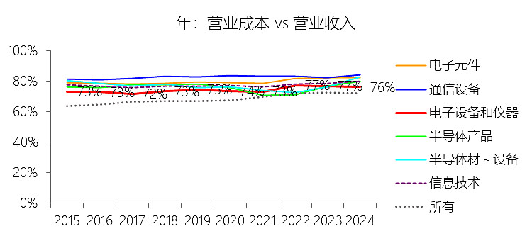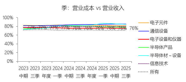 营业成本:2025年前三季,电子设备和仪器的营业成本为6646.47亿元,同比增长11.22%,与营业收入的比例为75.99%(营业成本率,即1-毛利率),同比上升0.03个百分点;2015-2024年(十年),此项合计为54847.15亿元,平均比例为74.85%,比信息技术行业的均值低2.86个百分点,长期呈上升趋势。比例短期上升主要由于2025年前三季度虽然电子设备和仪器行业在AI算力需求及半导体周期回暖带动下实现了11.18%的营业收入增长,但由于高端AI服务器、精密传感器等新一代硬件在量产初期的产能爬坡成本较高,且核心精密零部件的采购价格受供应链波动影响,导致营业成本增速(11.22%)微幅跑赢收入增速 ,使得营业成本率同比上升0.03个百分点;比例长期上升主要由于2015-2024年间,随着智能手机、PC等传统消费电子终端市场逐步进入成熟饱和的存量竞争阶段,行业整体定价权受限,叠加过去十年间原材料、精密组件及熟练技术工人成本的趋势性上涨,导致行业毛利空间受到持续挤压,营业成本率从2015年的73.24%波动上升至2024年的76.1%;比例低于信息技术行业的均值主要由于电子设备和仪器行业涵盖了半导体设备、精密检测仪器等具备极高技术壁垒和强溢价能力的细分领域 ,其作为“硬科技”核心资产,在产业链中的议价地位普遍优于电子元件(成本率约82.5%)或通信设备(成本率约84.36%)等环节,相比于广义信息技术行业中平均成本率更高的通用硬件组装或分销类业务,展现出更为卓越的成本控制效能和技术溢价水平。