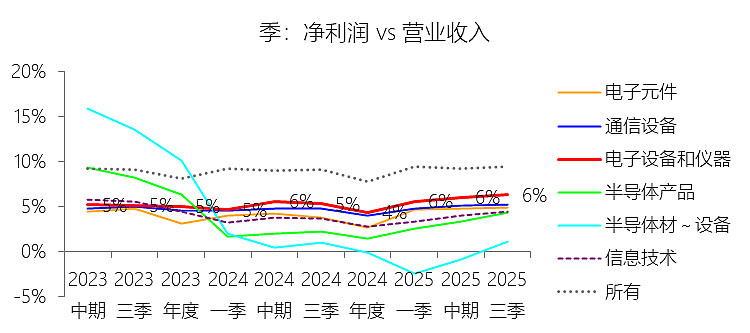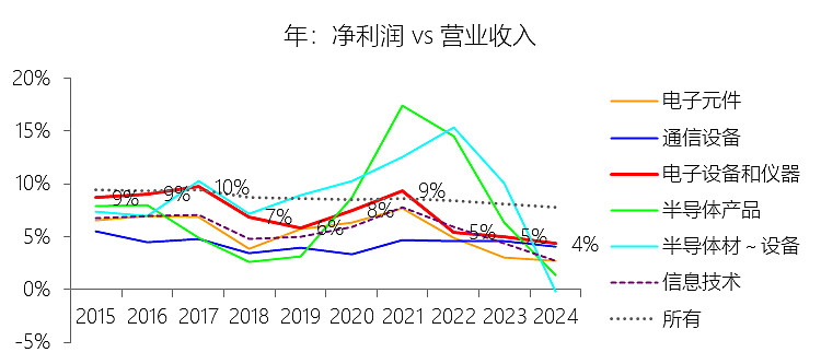 优劣:A股电子设备和仪器行业整体呈现出“硬科技底座稳固、周期复苏明显、盈利弹性突出,但长期增速放缓、成本与资本压力上升”的典型特征,兼具制造业的重资产属性与高技术壁垒带来的结构性溢价。从综合财务表现、成长能力、盈利质量与资产结构等维度看,可提炼为:电子设备和仪器行业十大优势:第一,受益于AI算力需求爆发、半导体周期回暖及工业自动化升级,2025年前三季收入同比增长11%以上,景气度明显回升,具备较强顺周期弹性;第二,2015—2024年收入年复合增速约17%,长期增速高于信息技术行业,体现硬件底层产业更强的规模扩张能力;第三,涵盖半导体设备、精密检测仪器等高壁垒赛道,技术门槛高、国产替代空间大,具备长期战略价值;第四,成本率长期低于信息技术行业均值,毛利水平相对稳健,显示较好的议价能力与技术溢价;第五,利润弹性显著,2025年前三季净利润增长30%以上,利润增速远高于收入,经营杠杆效果突出;第六,净利率与ROE长期均值高于信息技术行业,资本回报质量较好;第七,经营现金流/收入比长期维持较高水平,现金创造能力强于多数软硬件混合型行业,盈利“含金量”较高;第八,归母净利润占比接近或超过100%,股权集中度高,核心利润基本由母公司享有,治理结构清晰;第九,资产周转率呈长期改善趋势,在重资产制造属性下仍能提升运营效率,显示管理能力增强;第十,政策支持与产业链安全需求强化,国产化替代、设备自主可控和高端制造升级为行业提供持续成长空间。与此同时也存在明显短板:十大劣势:第一,长期收入增速自2017年高点后持续下行,行业由高速成长转入成熟阶段,增长中枢放缓;第二,营业成本率十年呈上升趋势,原材料、精密部件和人工成本上涨持续挤压毛利空间;第三,净利率长期走低,早期高盈利优势减弱,盈利稳定性受周期影响较大;第四,对半导体和消费电子景气度高度敏感,周期波动显著,业绩易大起大落;第五,重资产特征明显,设备与产线投入大、折旧高,固定成本刚性强;第六,负债率长期上升且高于信息技术行业均值,扩产与研发依赖债务融资,财务杠杆风险加大;第七,资产周转率仍低于轻资产的信息技术行业,资金占用高、回款周期长,效率天花板明显;第八,研发投入强度高且回收周期长,短期利润承压,部分子公司阶段性亏损拖累整体表现;第九,传统消费电子市场趋于饱和,低端环节同质化竞争激烈、价格战频发,结构分化加剧;第十,全球供应链波动与核心零部件依赖进口问题仍存,成本和交付稳定性易受外部环境冲击。总体而言,该行业具备“高壁垒、高技术含量、高盈利弹性”的核心竞争力,但同时承受“重资产、高资本开支、强周期性”的结构性约束,呈现典型的硬科技制造业收益与风险并存格局。