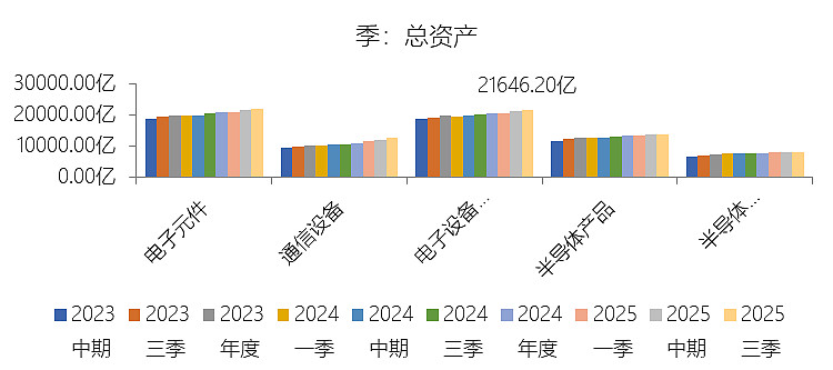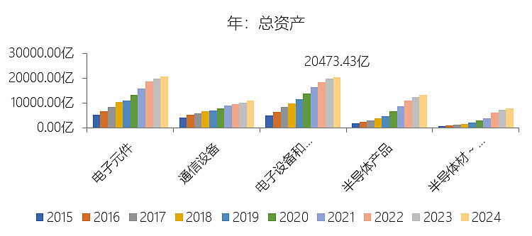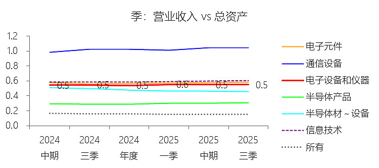 总资产增长率:2025年第三季末,电子设备和仪器的总资产为21646.20亿元,对比年初增长5.73%,增速同比(去年同期)上升1.57个百分点;2015-2024年(九年)增长313.49%,年复合增长17.08%,比信息技术行业的复合增速低0.25个百分点,长期呈下降趋势。增速短期上升主要由于2025年前三季度受益于AI算力需求爆发、半导体周期回暖以及工业自动化复苏,企业为应对市场需求增长积极扩大生产规模,带动了存货备货及应收账款等流动资产的规模扩张,且对比2024年全年低基数的表现实现了显著反弹。增速长期下降主要由于2015-2024年间,行业在经历智能手机红利期的高速增长后逐步步入成熟期,市场驱动力从大规模产能扩建转向技术迭代与存量升级,导致企业资本性开支的强度有所收敛,加之行业资产基数不断抬升,资产扩张的边际速度随之放缓。增速低于信息技术行业的复合增速主要由于电子设备和仪器行业属于硬件制造业,资产增长受到物理产能建设周期及制造工艺复杂度的双重约束,相比之下,广义信息技术行业涵盖了更具资本扩张弹性的云计算基础设施、软件服务以及通过高溢价并购实现资产快速膨胀的细分领域,其在资本驱动下的规模扩张速度略高于该行业。