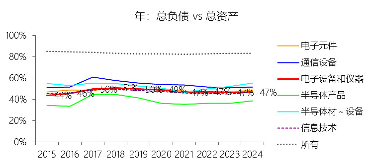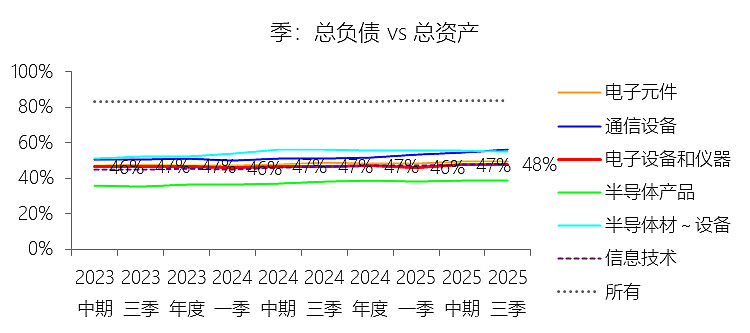 负债率:2025年第三季末,电子设备和仪器的总负债为10308.44亿元,对比年初增长7.31%,与总资产的比例为47.62%(负债率),对比年初上升0.7个百分点;2015-2024年(十年),此项合计为61912.91亿元,平均比例为47.66%,比信息技术行业的均值高0.83个百分点,长期呈上升趋势。比例短期上升主要由于2025年前三季度受益于AI算力需求爆发及半导体周期回暖,企业为了应对订单增长积极进行备货及产能扩充,导致短期借款及供应链应付款项的增速(7.31%)超过了总资产的扩张速度(5.73%),反映出行业在景气上升期通过财务杠杆加速业务布局的特征。比例长期上升主要由于2015-2024年间,行业正经历从传统消费电子向半导体设备、精密测量等高端硬科技领域的深度转型,此类领域具有极高的资本密集度和研发投入强度,在市场竞争加剧及原材料成本波动导致毛利空间承压的背景下,企业愈发依赖债务融资来支撑长周期的技术攻坚与产线升级。比例高于信息技术行业的均值主要由于电子设备和仪器行业属于典型的重资产制造业,其生产经营依赖昂贵的精密设备和复杂的制造产线,相比于信息技术行业中平均资产较轻、更多依赖人力资本与算法逻辑的软件及信息服务类企业,硬件制造在厂房建设、设备采购及存货周转方面对资金的刚性需求更高,从而在整体财务结构上展现出更高的负债水平。