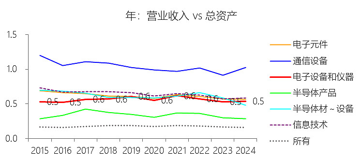 总资产周转率:2025年Q3 TTM,电子设备和仪器的总资产周转率为0.5次,同比略微上升;2015-2024年(十年),平均总资产周转率为0.6次,比信息技术行业的均值低0.07次,长期呈上升趋势。总资产周转率短期略微上升主要由于2025年前三季度受益于AI算力需求爆发及半导体周期回暖,行业营业收入实现了11.18%的稳健增长,这一增速明显跑赢了同期总资产5.73%的扩张速度,收入端的强劲反弹有效提升了存量资产的产出效率。总资产周转率长期上升主要由于2015-2024年间行业正处于由低端加工向精密仪器、半导体设备等高附加值环节转型的关键期,虽然资产基数随研发和产能建设持续扩大,但技术溢价带来的收入提振作用日益凸显,使得营业收入的复合增速(17.27%)略高于总资产的复合增速(17.08%),反映出行业整体运营效能随技术成熟度提升而稳步增强。总资产周转率低于信息技术行业的均值主要由于电子设备和仪器行业具有鲜明的“重资产”制造属性,其生产过程高度依赖昂贵的生产设备、复杂的检测线以及较长的原材料备货周期,相比于信息技术行业中平均资产较轻、更多依赖智力资本和软件算法迭代的互联网或软件服务类企业,硬件制造业的物理投入大、回款周期长,从而在客观上限制了资金的流转速率。