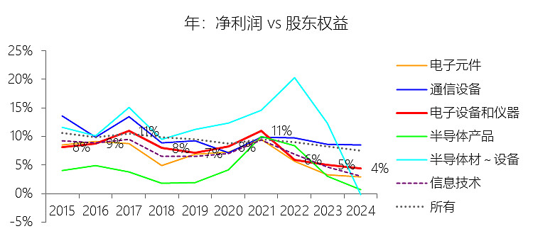 净利润增长率:2025年前三季,电子设备和仪器的净利润为549.82亿元,同比增长32.02%,增速同比上升23.53个百分点;2015-2024年(九年)增长110.67%,年复合增长8.63%,比信息技术行业的复合增速高5.04个百分点,长期呈下降趋势。增速短期上升主要由于2025年前三季度受益于AI算力需求爆发、半导体周期回暖以及工业自动化复苏,营业收入实现了11.18%的稳健增长;在收入扩张的同时,行业净利率同比上升0.99个百分点至6.29%,体现出显著的经营杠杆效应,使得利润增速(32.02%)远超营收增速;此外,2024年同期利润增速为8%的低位基数也助推了本期的反弹。增速长期下降主要由于2015至2024年间行业营业成本率从73.24%波动上升至76.1%,原材料及研发成本压力持续挤压利润空间,导致净利率从8.69%下滑至4.36%;随着传统电子消费市场进入成熟饱和期,行业增长动力由早期的爆发式扩张转入存量升级的平稳期。增速高于信息技术行业的复合增速主要由于电子设备和仪器行业作为硬科技制造的核心,在半导体设备和精密仪器等细分赛道拥有更高的技术壁垒和国产替代空间,其硬件资产驱动的成长韧性在应对宏观波动时表现出比以软件和服务为主的广义信息技术行业更强的获利稳定性,尤其在IT行业近年盈利大幅回调的背景下,该行业仍维持了更高的复合增长水平。