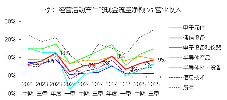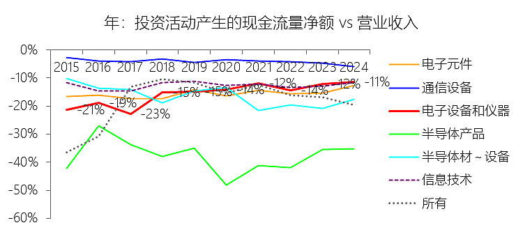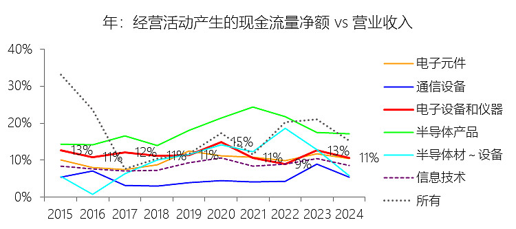 经营活动产生的现金流量净额:2025年前三季,电子设备和仪器的经营活动产生的现金流量净额为762.14亿元,同比增长43.06%,与营业收入的比例为8.71%,同比上升1.94个百分点;2015-2024年(十年),此项合计为8401.90亿元,平均比例为11.47%,比信息技术行业的均值高2.6个百分点,长期呈下降趋势。比例短期上升主要由于2025年前三季度受益于AI算力需求爆发及半导体周期回暖,行业营业收入和净利润实现大幅增长,带动了销售回款的显著增加,且在行业景气度上行期,企业通过优化供应链管理和加强存货周转,使得经营活动产生的现金流量净额增速(43.06%)远超营收增速,推动比例同比上升1.94个百分点;比例长期下降主要由于2015-2024年间,随着传统消费电子市场进入存量竞争阶段,行业整体毛利率受成本上升和价格压力影响持续承压,且企业为实现高端化转型不断加大研发投入,导致利润空间收窄,加之下游客户议价能力增强使得应收账款占用资金比例有所上升,单位收入转化现金的能力随之呈趋势性回落;比例高于信息技术行业的均值主要由于电子设备和仪器行业属于典型的重资产制造业,拥有规模庞大的固定资产和精密设备,其每年的折旧与摊销等非现金支出数额巨大,在经营现金流计算中作为调节加回项显著提升了现金流量净额,相比于信息技术行业中以轻资产、高人力成本支出为主的软件和服务类企业,硬件制造领域在规模化生产后表现出更强的现金获取能力和更优的现金流充裕度。