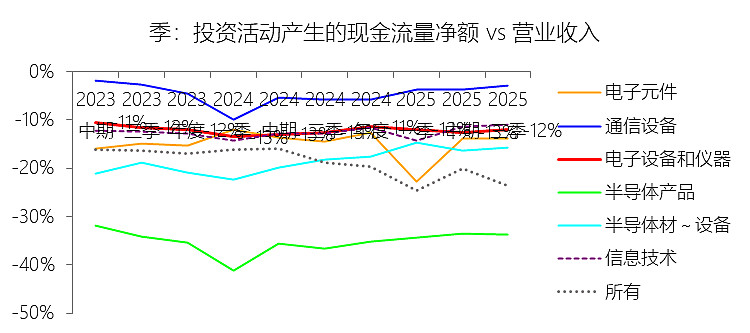 投资活动产生的现金流量净额:2025年前三季,电子设备和仪器的投资活动产生的现金流量净额为-1052.86亿元,绝对值同比增长6.05%,与营业收入的比例为-12.04%,同比上升0.58个百分点;2015-2024年(十年),此项合计为-10499.64亿元,平均比例为-14.33%,比信息技术行业的均值低1.8个百分点,长期呈上升趋势。比例短期上升主要由于2025年前三季度受益于AI算力需求爆发及半导体周期回暖,行业营业收入实现了11.18%的快速增长,而投资活动的现金流出绝对值仅增长了6.05%,收入端的强劲反弹使得投资支出在营收中的占比被相对稀释,反映出行业在景气度回升初期更多依靠提升现有产能利用率而非盲目扩大资本性开支;比例长期上升主要由于2015-2024年间行业从早期的产能快速扩张期逐步向技术驱动的高质量发展期转型,随着核心企业收入规模的持续放大,单位收入所需的边际投资投入有所下降,且在行业步入成熟期后,大规模的基础产线建设投入斜率较早期有所放缓,使得投资活动净流出占营收的比例呈趋势性收窄(即代数意义上的上升);比例低于信息技术行业的均值主要由于电子设备和仪器行业属于硬科技制造业,在半导体设备、精密检测仪等领域拥有极高的设备采购与厂房建设成本,具有典型的“重资产”属性,其资本性开支需求远高于信息技术行业中平均资产较轻、更多依赖智力资本和软件算法研发的广义服务及互联网类业务,从而导致该行业在投资活动中的现金净流出强度长期高于行业平均水平。