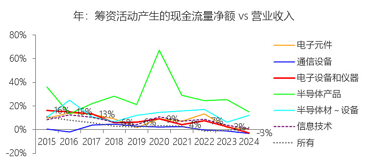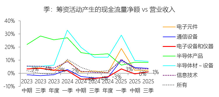 筹资活动产生的现金流量净额:2025年前三季,电子设备和仪器的筹资活动产生的现金流量净额为90.12亿元,与营业收入的比例为1.03%,同比上升5.07个百分点;2015-2024年(十年),此项合计为4275.25亿元,平均比例为5.83%,比信息技术行业的均值低0.8个百分点,长期呈下降趋势。比例短期上升主要由于2025年前三季度受益于AI算力需求爆发与半导体周期回暖,行业景气度显著回升带动了企业对技术攻坚及产能升级的资金需求,相比2024年同期行业处于周期底部、企业普遍以偿还债务或去杠杆为主的低基数背景,本期净融资活动有所回升,导致筹资现金流净额占营收的比例实现了明显反弹;比例长期下降主要由于2015-2024年间行业逐步从早期的爆发式扩张期进入成熟稳健期,随着营业收入与资产规模的持续壮大,早期依赖大规模股权融资或资本市场“输血”来建设基础产线的需求逐步减弱,且行业在长周期内展现出极强的经营现金流获取能力(十年平均比例达11.47%),日益增强的内生增长动力使得筹资活动净额在不断扩大的收入规模中所占比例呈趋势性收窄;比例低于信息技术行业的均值主要由于电子设备和仪器行业作为具备核心壁垒的硬科技制造业,其盈利稳定性与经营现金流转化率长期优于广义信息技术行业,在满足资本开支后的留存收益更为充裕,相比于信息技术行业中平均资产较轻但处于高成长、高获客成本阶段且需持续依赖融资维持运营的软件或互联网服务类企业,该行业对外部筹资的依赖度更低,表现出更强的财务自给能力。