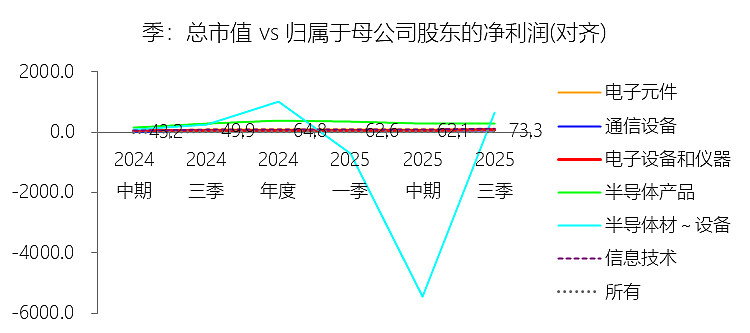 市盈率:2025年Q3 TTM,电子设备和仪器的归属于母公司股东的净利润(对齐)为615.97亿元,对比年初增长31.23%,总市值与归属于母公司股东的净利润(对齐)的比例为73.3倍(市盈率),对比年初上升8.57个倍数;2015-2024年(十年),此项合计为4217.01亿元,平均比例为48.1倍,比信息技术行业的均值低10.07个倍数,长期呈下降趋势。比例短期上升主要由于2025年AI算力革命与半导体周期反转引发了二级市场的强烈预期,导致总市值增速(48.59%)显著快于归母净利润的增长速度(31.23%),估值修复在景气度上行初期走在了业绩释放的前面;比例长期下降主要由于2015-2024年间行业逐渐由早期的概念驱动、高速扩张阶段转向以业绩为核心的成熟发展阶段,随着行业基数不断扩大和市场对硬科技企业盈利确定性要求的提高,早期的估值溢价随泡沫消化而持续向均值回归;比例低于信息技术行业的均值主要由于电子设备和仪器行业属于资本密集、投入大的硬件制造业,受物理产能、供应链成本及资产折旧周期制约明显,相比于信息技术行业中平均资产较轻、具备极高边际扩张效率及高估值溢价的软件服务和互联网细分领域,硬件制造环节的盈利弹性与商业模式的轻盈度相对受限,因而其市盈率中枢通常低于全行业平均水平。
