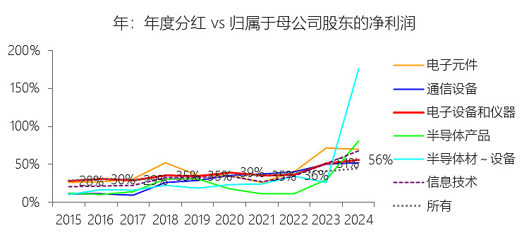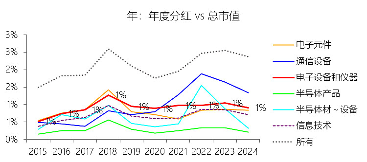 年度分红:2024年,电子设备和仪器的年度分红为277.95亿元,同比增长0.02%,与归属于母公司股东的净利润的比例为56.24%(分红率),同比上升4.82个百分点;2015-2024年(十年),此项合计为1882.03亿元,平均比例为38.51%,比信息技术行业的均值高3.53个百分点,长期呈上升趋势。比例短期上升主要由于2024年全球宏观经济波动及下游消费电子需求阶段性放缓,导致行业归母净利润出现一定程度的回撤,而行业内成熟龙头企业为稳定资本市场预期、强化投资者回报,维持了相对稳健的现金分红总额,在利润基数缩减的背景下,分红率呈现出被动上升的态势。比例长期上升主要由于2015-2024年间行业逐渐由早期的资本高强度扩张期向高质量发展阶段转型,随着企业内生造血能力增强及资本开支斜率放缓,行业积累了丰厚的未分配利润,加之政策层面持续引导上市公司加强分红管理,企业分红习惯逐步养成并制度化,推动了利润分配比例的持续中枢上移。比例高于信息技术行业的均值主要由于电子设备和仪器行业具有鲜明的“重资产”属性,在完成大规模产线建设和技术布局后,通过折旧与摊销产生的非现金性支出占比较高,使得其实际经营现金流往往比账面利润更为充裕,相比于信息技术行业中平均资产较轻但仍处于高研发投入、高成长获客阶段且盈利波动较大的软件服务或互联网类企业,硬件制造业在成熟期具备更强的现金流分配能力和更稳健的利润分配倾向。
