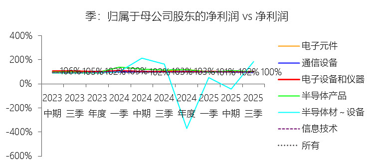 归属于母公司股东的净利润:2025年前三季,电子设备和仪器的归属于母公司股东的净利润为552.51亿元,同比增长28.34%,与净利润的比例为100.49%,同比下降2.88个百分点;2015-2024年(十年),此项合计为4886.70亿元,平均比例为99.56%,比信息技术行业的均值高2.82个百分点,长期呈上升趋势。比例短期下降主要由于2025年前三季度受益于AI需求爆发及半导体周期回暖,行业营业收入和净利润实现大幅增长,带动了产业链内此前处于研发投入期或亏损状态的部分控股子公司盈利能力改善或亏损收窄,少数股东损益贡献由负转正或占比回升,从而使得归母净利润占净利润的比例从极高位同比下降2.88个百分点。比例长期上升主要由于2015-2024年间,行业内上市公司为强化对精密仪器及半导体设备等核心硬科技环节的控制,持续推进对重要子公司的股权增持与并表操作,且在行业向高端化转型过程中,由于部分控股子公司处于高额研发投入阶段而出现经营亏损,导致归属于母公司的净利润份额在抵消少数股东亏损后在数值上进一步凸显,使得该比例从2015年的约92%波动上升至近年来的100%以上。比例高于信息技术行业的均值主要由于电子设备和仪器行业具有更高的技术壁垒与资产密集度,企业为了保障核心制造工艺的独立性与知识产权的安全性,其股权结构通常比以软件服务、轻资产运营为主的信息技术行业更为集中,母公司对核心盈利实体的持股比例普遍更高,加之硬件研发周期长导致的子公司阶段性亏损现象在统计上拉高了母公司利润占比,使其在十年均值上展现出比信息技术行业更高的归母集中度。