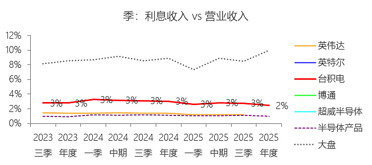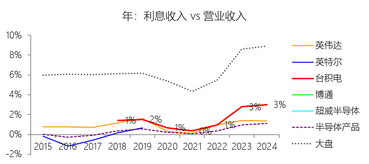 利息收入:2025年,台积电的利息收入为30.38亿美元,同比增长11.33%,与营业收入的比例为2.45%,同比下降0.56个百分点;2015-2024年(十年),此项合计为68.46亿美元,平均比例为1.39%,比半导体产品行业的均值高0.95个百分点,长期呈上升趋势。比例短期下降主要由于2025年台积电营业收入录得36.85%的强劲增长,增速远高于同期利息收入11.33%的增速,导致利息收入占营收的比例出现结构性摊薄。比例长期上升主要由于台积电在过去十年(2015-2024年)凭借技术领先带来的卓越盈利能力,经营活动产生的现金流净额持续扩大,使其现金及现金等价物余额从2017年底的约5534亿新台币跨越式增长至2024年底的约2.13万亿新台币。在此基础上,公司积极执行现金管理政策,将庞大的流动性资产主要投向定期存款及高评级固定收益证券,从而在近年来全球利率中枢上行的背景下捕获了更高的利息回报。比例高于半导体产品行业的均值主要由于台积电作为全球晶圆代工领导者,拥有远超行业平均水平的经营现金流生成能力,且为了应对动辄数百亿美元的先进制程资本支出,其维持的现金及现金等价物占总资产比例(2025年末约34.89%)显著高于行业平均水平(约15.69%)。这种极高的现金储备规模配合审慎的投资策略,使其能够在保证资金安全与流动性的前提下,持续赚取远高于半导体产品行业均值的财务收益。