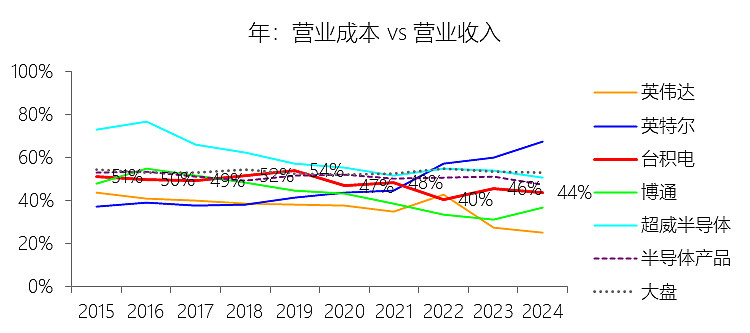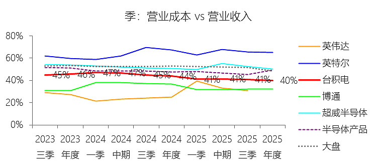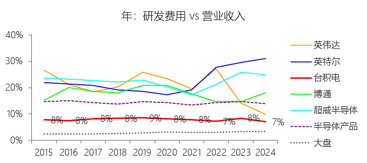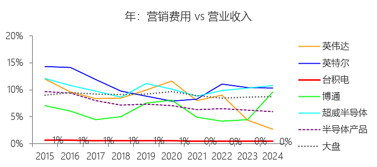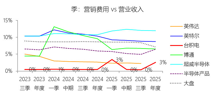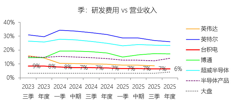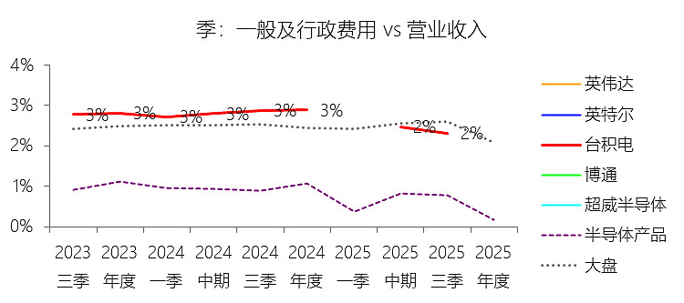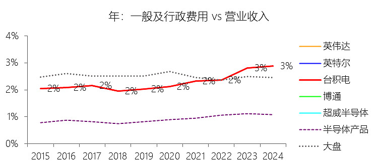 一般及行政费用:2025年,台积电的一般及行政费用为零美元,与营业收入的比例为0.00%,同比持平;2015-2024年(十年),此项合计为117.85美元,平均比例为2.40%,比半导体产品行业的均值高1.45个百分点,长期呈上升趋势。