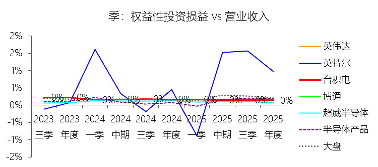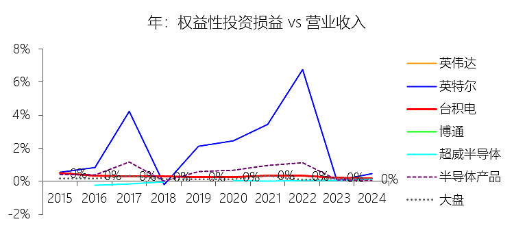 权益性投资损益:2025年,台积电的权益性投资损益为1.79亿美元,同比增长17.12%,与营业收入的比例为0.14%,同比下降0.02个百分点;2015-2024年(十年),此项合计为14.04亿美元,平均比例为0.29%,比半导体产品行业的均值低0.25个百分点,长期呈下降趋势。比例短期下降主要由于2025年台积电营业收入录得36.85%的强劲增长,其增速远高于同期权益性投资损益17.12%的增速,导致该项损益在整体营收中的占比出现结构性稀释。比例长期下降主要由于台积电在过去十年(2015-2024年)始终坚持以纯晶圆代工为核心的战略聚焦,将绝大部分资本支出和资源投向先进制程的研发与产能建设,其权益性投资主要出于战略目的而非单纯的财务获利。随着公司凭借技术领先和人工智能需求爆发实现核心代工收入的跨越式增长(年复合增速达14.98%),来自联营企业的损益贡献在持续膨胀的业务总规模面前占比不断缩小,且部分早期战略性投资(如2015年处置ASML股份)的收益贡献在后期逐渐减弱。比例低于半导体产品行业的均值主要由于台积电独特的纯晶圆代工定位,使其无需像行业均值中包含的部分IDM厂商或控股集团那样通过复杂的跨行业合资或股权参与来构建版图。在“Foundry 2.0”模式下,台积电绝大多数的核心生产、掩模和先进封装活动均由其全资控股体系完成并已实现并表,其非并表的联营企业(如世界先进、精材等)规模相对于其数千亿美元的总资产及千亿美元级的营收规模而言微乎其微,这种高度集中的内生增长结构决定了其权益性投资损益占比长期处于行业较低水平。