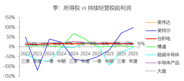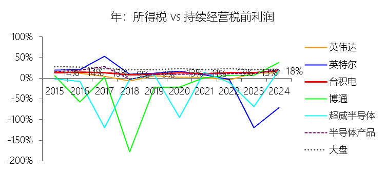 所得税率:2025年,台积电的所得税为106.16亿美元,同比增长36.63%,与持续经营税前利润的比例为15.98%(所得税率),同比下降1.68个百分点;2015-2024年(十年),此项合计为288.72亿美元,平均比例为13.28%,比半导体产品行业的均值高0.33个百分点,长期呈上升趋势。