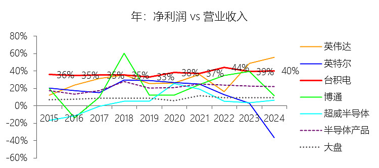 营业收入增长率:2025年,台积电的营业收入为1239.36亿美元,同比增长36.85%,增速同比上升1.23个百分点;2015-2024年(九年)增长251.3%,年复合增长14.98%,比半导体产品行业的复合增速高3.24个百分点,长期呈上升趋势。增速短期上升主要由于台积电领先的制程技术,特别是3纳米和5纳米等先进工艺获得了强劲的市场需求,同时2025年全年受益于人工智能(AI)相关需求的持续爆发,AI加速器贡献了其总营收的高双位数百分比。此外,较高的产能利用率、持续的成本改善努力以及2025年先进工艺(7纳米及以下)在晶圆总营收中占比提升至74%,共同抵消了部分汇率波动等不利影响,推动了短期营收增速的进一步上升。增速长期上升主要由于台积电过去十年始终坚持技术领先、卓越制造和客户信任的核心战略,通过持续的高研发投入(营收占比约8%)和大规模资本支出,确立了在摩尔定律演进中的领导地位,实现了从28纳米到3纳米工艺的快速扩产与迭代。同时,5G、高效能运算(HPC)及AI等全球大趋势推动了各类电子设备中半导体含量的结构性增长,叠加台积电在先进工艺节点上的议价能力和产品组合优化,使其营收规模在十年间实现了跨越式增长。增速高于半导体产品行业的复合增速主要由于台积电凭借强大的技术差异化和“Foundry 2.0”模式(涵盖逻辑晶圆制造、封装、测试等整合服务),在先进逻辑工艺和先进封装领域保持了极高的市场占有率并持续赚取技术溢价。其作为全球数家IC设计公司信赖的产能提供者,充分受益于无晶圆厂(fabless)公司的崛起、IDM外包比例的增加以及系统厂商自研芯片(ASIC)趋势的扩大,从而在整体行业增长的基础上获得了显著的超额增量。