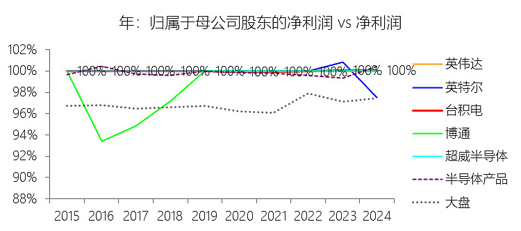 归属于母公司股东的净利润:2025年,台积电的归属于母公司股东的净利润为558.95亿美元,同比增长54.21%,与净利润的比例为100.14%,同比上升0.07个百分点;2015-2024年(十年),此项合计为1884.65亿美元,平均比例为100.00%,比半导体产品行业的均值高0.16个百分点,长期呈上升趋势。