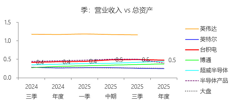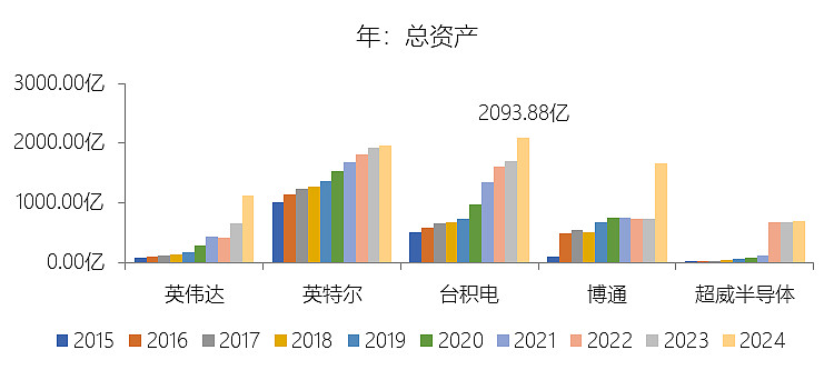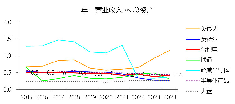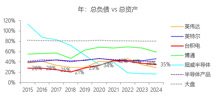 总资产增长率:2025年末,台积电的总资产为2581.19亿美元,对比年初增长23.27%,增速同比(去年同期)上升0.74个百分点;2015-2024年(九年)增长313.37%,年复合增长17.08%,比半导体产品行业的复合增速高2.44个百分点,长期呈上升趋势。增速短期上升主要由于2025年台积电维持了极高水平的资本支出(全年达409亿美元),用于扩充3纳米、2纳米及CoWoS先进封装产能,直接推动其物业、厂房及设备金额在年末达到1201.22亿美元,对比年初增长18.67%。同时,得益于AI相关需求爆发带来的强劲经营现金流(达2.3万亿新台币),公司现金及现金等价物余额在2025年末增长35.28%至900.58亿美元,共同驱动了总资产增速的同比上升。增速长期上升主要由于台积电过去十年始终坚持技术领先战略,在摩尔定律演进中持续投入巨额研发与资本支出,实现了先进制程(如7纳米、5纳米、3纳米)的快速迭代与全球GigaFab集群的战略布局。5G、高效能运算及人工智能等全球结构性大趋势驱动了对先进制程产能的长期渴求,支撑台积电利用强大的经营杠杆将盈利持续转化为资产扩张,实现了近十年资产规模的跨越式增长。增速高于半导体产品行业的复合增速主要由于台积电在先进逻辑制造及先进封装领域占据了绝对的领导地位(2024年占Foundry 2.0产值的34%),并凭借其独特且受客户信任的商业模式捕获了行业内最高价值的部分。此外,为了支持全球化扩张并满足客户对产能灵活性的需求,台积电在亚利桑那、熊本及德累斯顿等地实施了行业内最大规模的跨国投资计划(如在美累计投资额达1650亿美元),并获得了庞大的政府补助与政策支持,这些战略性投入使其资产复合增速显著超越了行业平均水平。