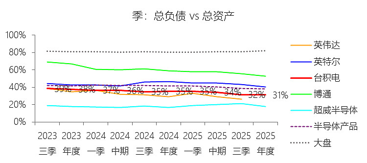 现金及现金等价物:2025年末,台积电的现金及现金等价物为900.58亿美元,对比年初增长35.28%,与总资产的比例为34.89%,同比上升3.1个百分点;2015-2024年(十年),此项合计为3030.89亿美元,平均比例为27.80%,比半导体产品行业的均值高14.69个百分点,长期呈下降趋势。