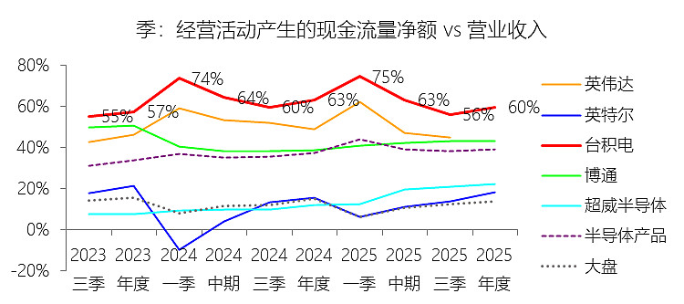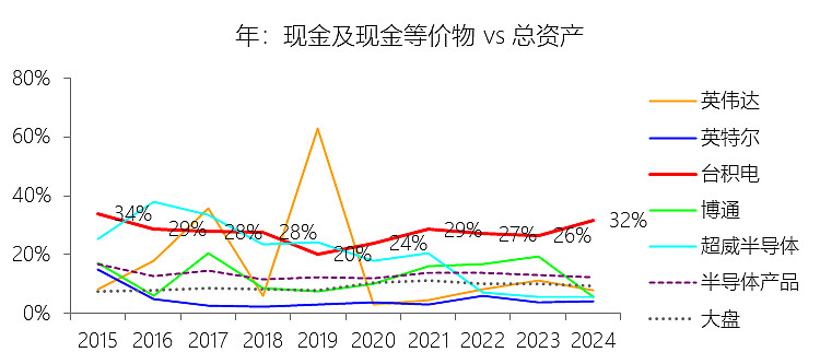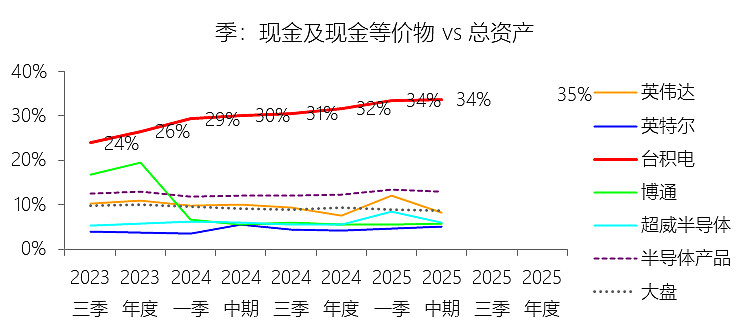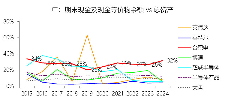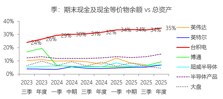 期末现金及现金等价物余额:2025年末,台积电的期末现金及现金等价物余额为900.58亿美元,对比年初增长35.28%,与总资产的比例为34.89%,同比上升3.1个百分点;2015-2024年(十年),此项合计为3030.89亿美元,平均比例为27.80%,比半导体产品行业的均值高14.54个百分点,长期呈下降趋势。
