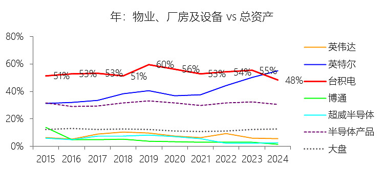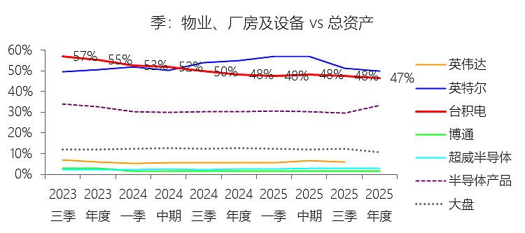 物业、厂房及设备:2025年末,台积电的物业、厂房及设备为1201.22亿美元,对比年初增长18.67%,与总资产的比例为46.54%,同比下降1.8个百分点;2015-2024年(十年),此项合计为5806.38亿美元,平均比例为53.26%,比半导体产品行业的均值高22.08个百分点,长期呈下降趋势。
