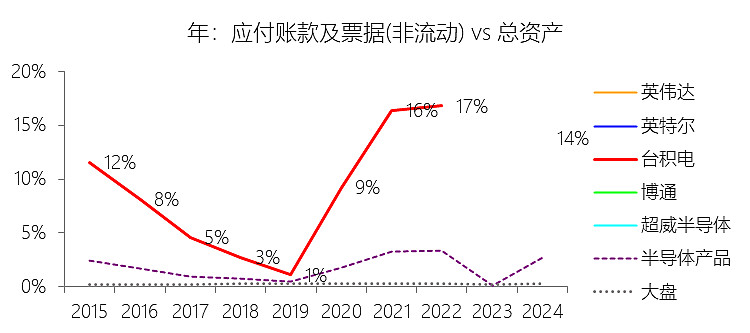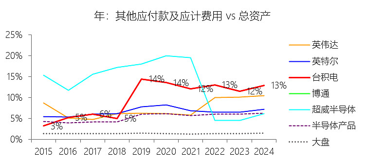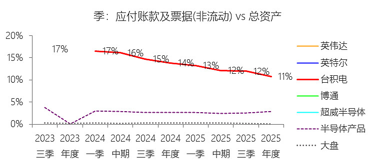 应付账款及票据(非流动):2025年末,台积电的应付账款及票据(非流动)为278.59亿美元,对比年初减少3.91%,与总资产的比例为10.79%,同比下降3.05个百分点;2015-2024年(十年),此项合计为1032.59亿美元,平均比例为9.47%,比半导体产品行业的均值高7.61个百分点,长期呈上升趋势。