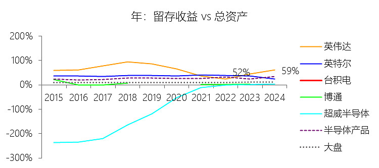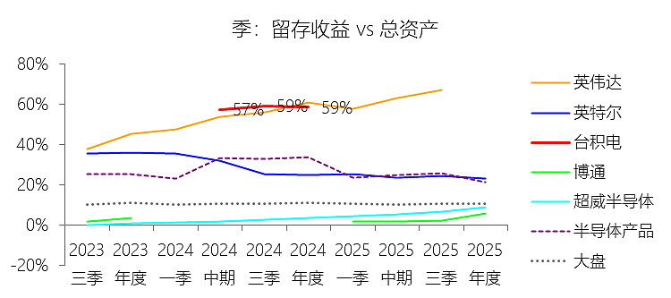 留存收益:2025年末,台积电的留存收益为零美元,与总资产的比例为0.00%,同比持平;2015-2024年(十年),此项合计为2064.70美元,平均比例为18.94%,比半导体产品行业的均值低9.25个百分点,长期呈上升趋势。