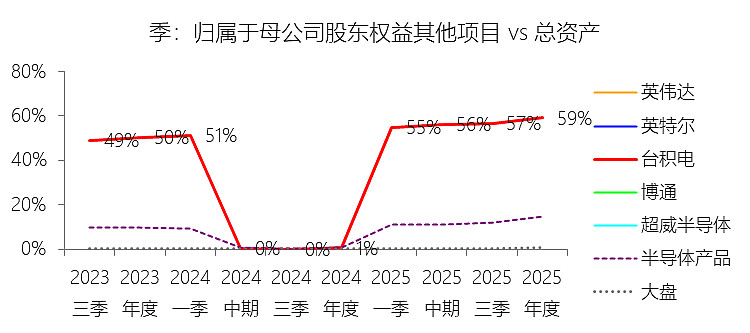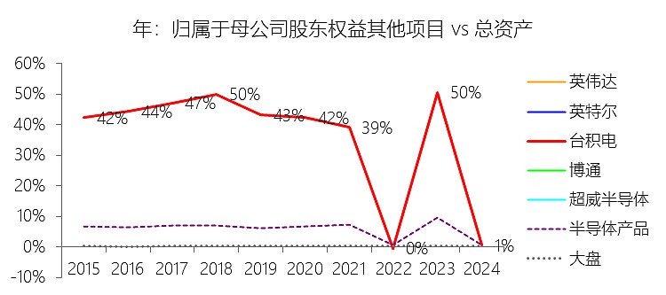 归属于母公司股东权益其他项目:2025年末,台积电的归属于母公司股东权益其他项目为1525.47亿美元,对比年初增长12496.14%,与总资产的比例为59.10%,同比上升58.52个百分点;2015-2024年(十年),此项合计为3246.59亿美元,平均比例为29.78%,比半导体产品行业的均值高24.49个百分点,长期呈下降趋势。