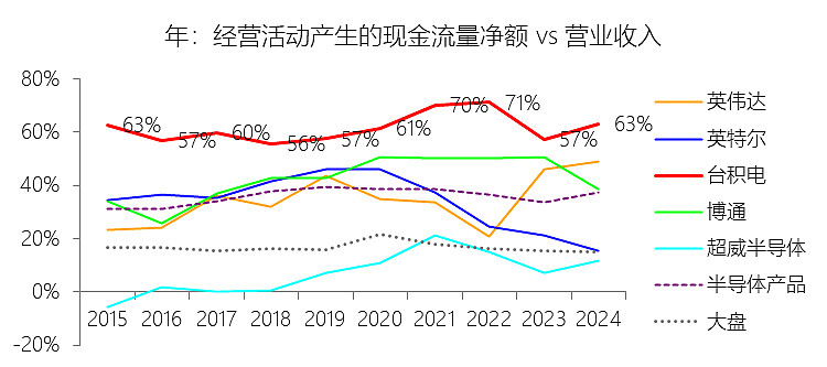 经营活动产生的现金流量净额:2025年,台积电的经营活动产生的现金流量净额为740.21亿美元,同比增长29.54%,与营业收入的比例为59.73%,同比下降3.37个百分点;2015-2024年(十年),此项合计为3079.38亿美元,平均比例为62.67%,比半导体产品行业的均值高26.38个百分点,长期呈上升趋势。比例短期下降主要由于2025年台积电营业收入录得36.85%的强劲增长,增速显著超过了同期经营现金流29.54%的增速,导致该比例在营收快速扩张过程中出现结构性摊薄。具体而言,2025年随着盈利大幅增长,公司支付的所得税款显著增加,且在业务规模跨越式提升过程中,营运资金的变动(如营运资本占用)对现金流转化产生了一定影响,导致经营现金流增速滞后于收入增速。比例长期上升主要由于台积电在过去十年(2015-2024年)始终处于技术前沿,先进制程(7纳米及以下)营收占比从2019年的27%跨越式增长至2024年的69%,驱动了盈利能力的稳健上行。同时,作为重资产的行业领导者,公司持续投入巨额资本支出构建GigaFab集群,由此产生的庞大折旧与摊销费用作为非现金项目被重新加回,随资产规模的扩张而持续推高了经营现金流的总额。比例高于半导体产品行业的均值主要由于台积电凭借“Foundry 2.0”模式在先进逻辑工艺和先进封装领域占据了极高的市场占有率,持续赚取垄断性的技术溢价,其平均净利率比行业均值高出16.56个百分点。相比行业内包含的大量轻资产设计公司或IDM厂商,台积电极高的资本密集度意味着其折旧与摊销在营收中占有更大比重,且公司凭借卓越的信用与客户深度信任,在某些周期中能获得客户预付款支持,这些特有的业务属性使其经营现金流生成能力远超半导体产品行业的平均水平。