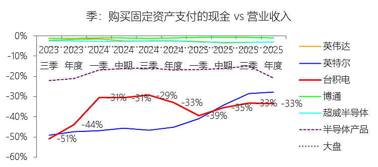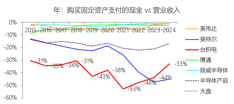 购买固定资产支付的现金:2025年,台积电的购买固定资产支付的现金为-414.01亿美元,绝对值同比增长38.53%,与营业收入的比例为-33.40%,同比下降0.41个百分点;2015-2024年(十年),此项合计为-1967.05亿美元,平均比例为-40.03%,比半导体产品行业的均值低21.79个百分点,长期呈下降趋势。