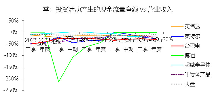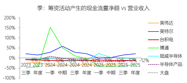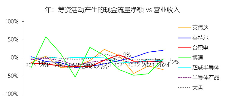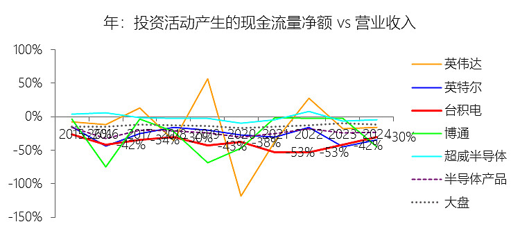 投资活动产生的现金流量净额:2025年,台积电的投资活动产生的现金流量净额为-372.35亿美元,绝对值同比增长37.6%,与营业收入的比例为-30.04%,同比下降0.16个百分点;2015-2024年(十年),此项合计为-1969.22亿美元,平均比例为-40.08%,比半导体产品行业的均值低16.79个百分点,长期呈下降趋势。比例短期下降主要由于2025年台积电为了扩充3纳米、2纳米以及CoWoS先进封装产能,购买固定资产支付的现金录得414.01亿美元,绝对值同比增长38.53%,其增速略快于同期营业收入36.85%的强劲增幅,导致投资活动现金流净流出占营收的比例在2024年(-29.88%)的基准上微降0.16个百分点至-30.04%。比例长期下降主要由于过去十年(2015-2024年)公司始终处于全球逻辑工艺技术前沿,为了确立摩尔定律演进中的领导地位,必须在营收规模实现跨越式增长之前,预先投入数千亿美元用于昂贵的精密厂房及设备建设,这种持续且高强度的资本支出计划使得投资性现金净流出规模随先进制程迭代(如从28纳米向3纳米演进)而结构性扩张。比例低于半导体产品行业的均值主要由于台积电作为纯晶圆代工领导者,其“Foundry 2.0”模式具有典型的重资产与资本密集特性,必须维持庞大的物业、厂房及设备规模以构建竞争壁垒(十年平均支出占比达40.03%),而半导体产品行业均值中包含了大量无须承担生产制造支出的轻资产芯片设计公司(Fabless)以及部分外包比例较高的厂商,这使得台积电的投资强度和占比绝对值在统计上显著高于行业平均水平。