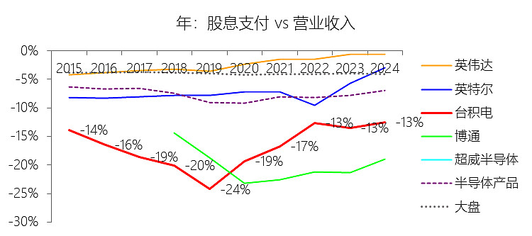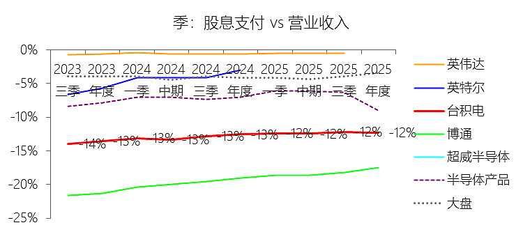 股息支付:2025年,台积电的股息支付为-151.88亿美元,绝对值同比增长33.7%,与营业收入的比例为-12.25%,同比上升0.29个百分点;2015-2024年(十年),此项合计为-779.96亿美元,平均比例为-15.87%,比半导体产品行业的均值低8.18个百分点,长期呈上升趋势。