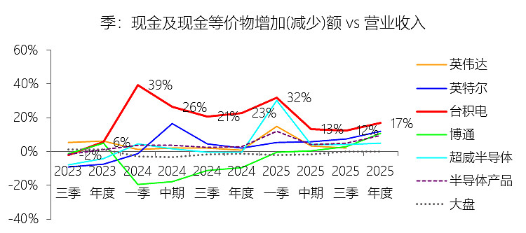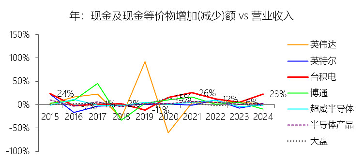 现金及现金等价物增加(减少)额:2025年,台积电的现金及现金等价物增加(减少)额为208.31亿美元,同比增长0.54%,与营业收入的比例为16.81%,同比下降6.07个百分点;2015-2024年(十年),此项合计为580.03亿美元,平均比例为11.80%,比半导体产品行业的均值高8.54个百分点,长期呈上升趋势。