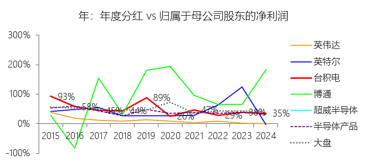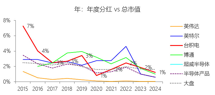 股息率:2024年,台积电的股息率为1.25%,同比下降0.63个百分点;2015-2024年(十年),平均股息率为2.00%,比半导体产品行业的均值高0.72个百分点,长期呈下降趋势。