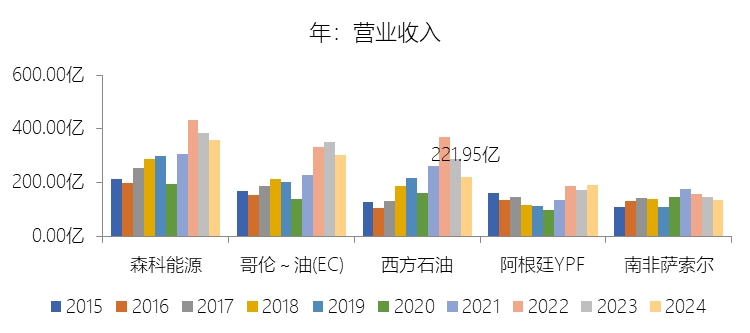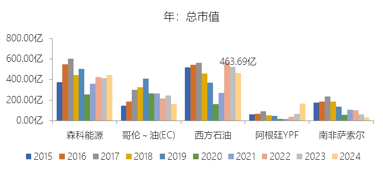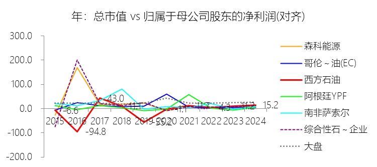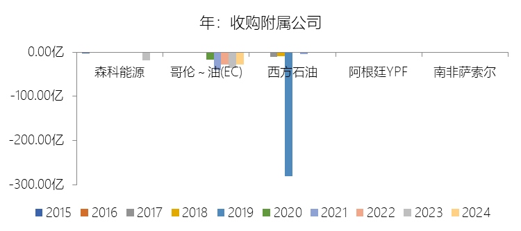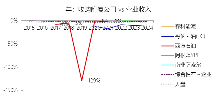 收购附属公司:2024年,西方石油的收购附属公司缺数据,与营业收入的比例无效;2015-2024年(十年),此项合计为-306.25美元,平均比例为-14.74%,比综合性石油与天然气企业行业的均值低13.27个百分点,长期呈上升趋势。