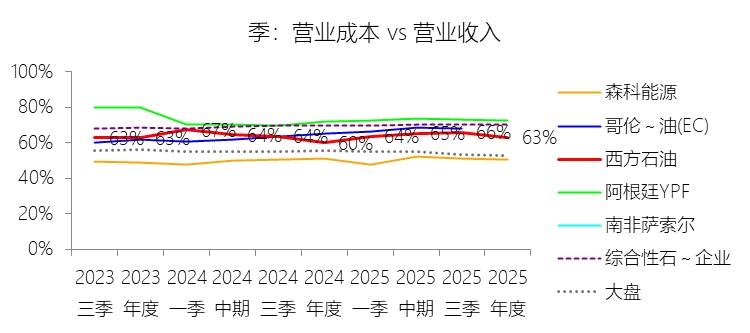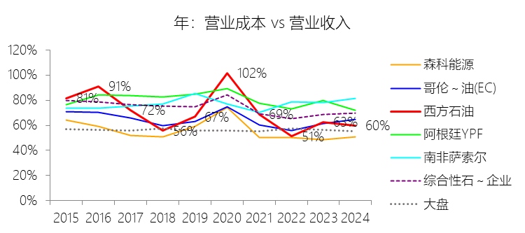 营业成本:2025年,西方石油的营业成本为138.74亿美元,同比增长4.34%,与营业收入的比例为62.85%(营业成本率,即1-毛利率),同比上升2.94个百分点;2015-2024年(十年),此项合计为1395.78亿美元,平均比例为67.16%,比综合性石油与天然气企业行业的均值低5.99个百分点,长期呈下降趋势。这里的营业成本包含Depreciation, depletion and amortization。比例短期上升主要由于2025年全球原油实现价格同比显著下跌(WTI均价降幅约14%),导致营业收入端出现同比微降,而成本端受CrownRock资产全年产量贡献的影响,计提的折旧、损耗及摊销(DD&A)费用随产销规模扩大而同比增长8.37%,这种收入端的外部波动与费用端的刚性增长形成了阶段性背离,导致成本占比上升。比例长期下降主要由于公司自2019年以来持续执行资产瘦身战略,陆续剥离了加纳、哥伦比亚、南德克萨斯等高操作成本的非核心资产,并将投资精准聚焦于全球最具成本竞争力的二叠纪盆地核心区,通过规模效应和技术优化(如钻完井成本下降)显著压降了单位生产成本;同时,公司在2015年及2020年低油价周期计提了累计超过200亿美元的巨额资产减值准备,实质性减记了资产账面价值,从而大幅降低了后续年度计提折旧、损耗及摊销的基数。比例低于综合性石油与天然气企业行业的均值主要由于西方石油独特的业务组合,其资产高度集中于低成本、高丰度的页岩油气资产和具备行业领先成本优势的化学业务(OxyChem),与传统的综合性石油巨头相比,公司缺乏低毛利、高操作成本的下游炼油及零售环节,这使得其整体营业成本相对于收入的比例天然处于较低水平;此外,由于公司在十年统计区间内经历了更为激进的去杠杆和资产负债表重塑,其通过巨额减值及高产出效率资产置换所形成的成本优势,使其盈利质量在财务账面上优于资产结构更趋多元且入账时间更久的行业平均水平。