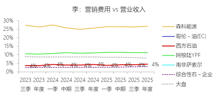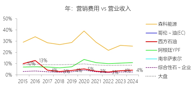 营销费用:2025年,西方石油的营销费用为9.86亿美元,同比增长2.71%,与营业收入的比例为4.47%,同比上升0.14个百分点;2015-2024年(十年),此项合计为93.39亿美元,平均比例为4.49%,比综合性石油与天然气企业行业的均值高1.72个百分点,长期呈下降趋势。
