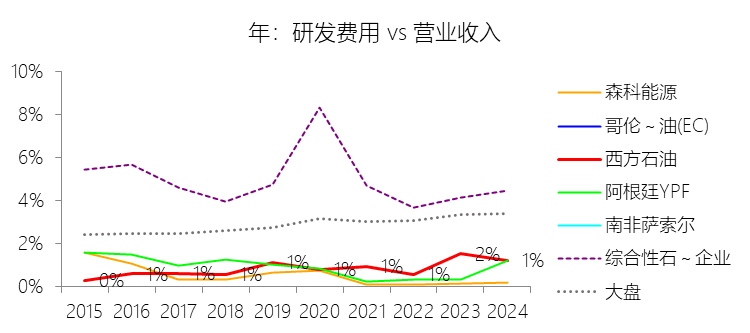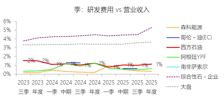 研发费用:2025年,西方石油的研发费用为2.49亿美元,同比减少9.45%,与营业收入的比例为1.13%(研发费用率),同比下降0.11个百分点;2015-2024年(十年),此项合计为18.53亿美元,平均比例为0.89%,比综合性石油与天然气企业行业的均值低3.85个百分点,长期呈上升趋势。