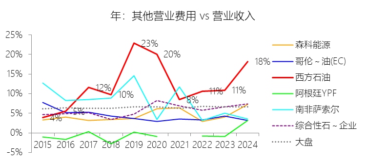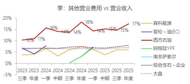 其他营业费用:2025年,西方石油的其他营业费用为38.54亿美元,同比减少4.65%,与营业收入的比例为17.46%,同比下降0.75个百分点;2015-2024年(十年),此项合计为260.37亿美元,平均比例为12.53%,比综合性石油与天然气企业行业的均值高6.78个百分点,长期呈上升趋势。