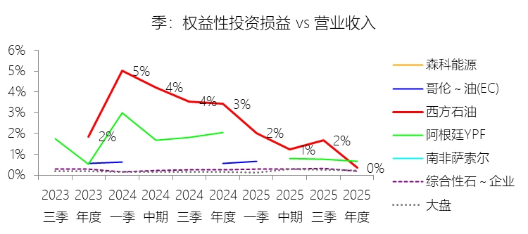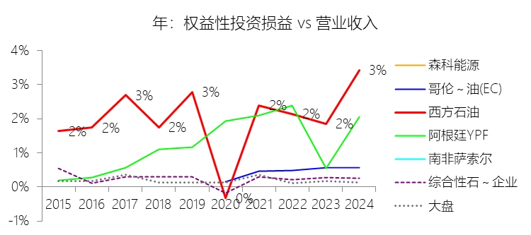 权益性投资损益:2025年,西方石油的权益性投资损益为0.76亿美元,同比减少89.99%,与营业收入的比例为0.34%,同比下降3.08个百分点;2015-2024年(十年),此项合计为43.47亿美元,平均比例为2.09%,比综合性石油与天然气企业行业的均值高1.83个百分点,长期呈上升趋势。比例短期下降主要由于公司在2025年录得了约4.01亿美元针对NET Power的巨额权益性投资减值损失,导致该项投资的账面价值直接降至零,且2025年因WES完成收购活动产生的权益变动收益(约3.01亿美元)远低于2024年同期因大规模出售WES单位及分享其资产剥离收益所带来的非经常性利得,加之2025年全球原油实现价格下跌导致各合资项目(如DEL、WES等)的底层利润端受到挤压,共同驱动了损益规模及比例的剧烈回落;比例长期上升主要由于公司在2019年完成对阿纳达科(Anadarko)的世纪收购后,因治理结构调整于2019年底丧失了对西部中游业务(WES)的控制权,将其从合并报表范围转为权益法核算,这一战略转变使得此前通过合并利润表体现的中游收益在后续年度转而以巨额权益法损益形式体现,同时公司近年来战略性地利用低碳风险投资公司(OLCV)通过权益投资模式孵化NET Power、Carbon Engineering等技术项目,配合国际成熟合资项目(如Dolphin Energy及Al Hosn)的持续盈利贡献,实现了权益性投资损益规模的历史性跨越;比例高于综合性石油与天然气企业行业的均值主要由于西方石油采取了独特的资产运作模式,其将WES这一核心支柱级中游资产置于非合并范围,使得利润来源高度向“权益损益”项集中,而同行业其他综合性巨头通常将类似规模的管道与营销资产完全并表处理;此外,公司在二叠纪盆地开发及中东 sour gas 等高壁垒领域频繁运用合资模式(如50%比例的Ingleside设施、40%比例的Al Hosn项目等)来分担高额资本支出并共享技术红利,这种对合伙制运营模式的高度依赖,导致其权益法项下的盈利占比天然高于业务结构更为传统和集权的综合性石油同行。