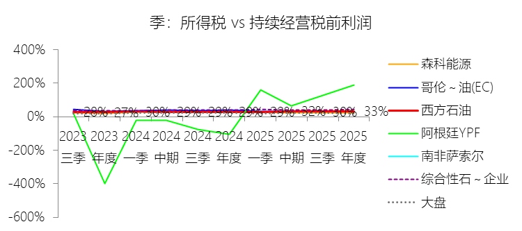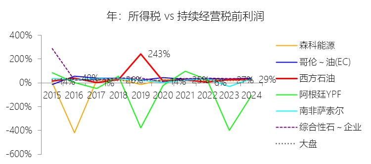 所得税率:2025年,西方石油的所得税为10.21亿美元,同比减少11.83%,与持续经营税前利润的比例为32.64%(所得税率),同比上升3.86个百分点;2015-2024年(十年),此项合计为28.10亿美元,平均比例为32.22%,比综合性石油与天然气企业行业的均值低9.14个百分点,长期呈下降趋势。
