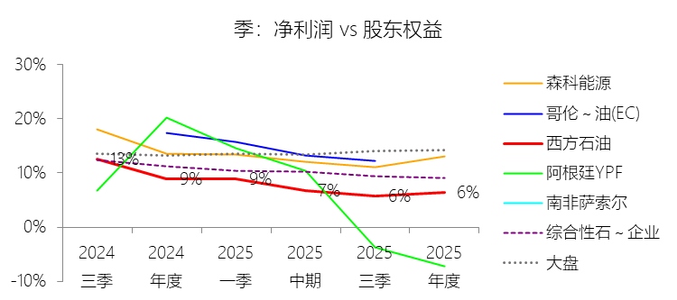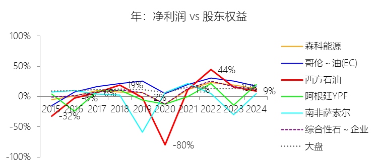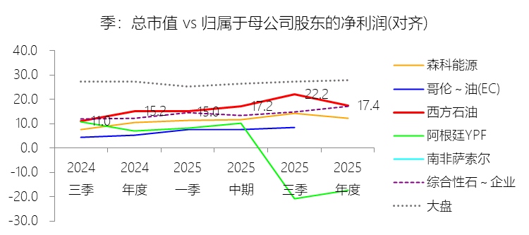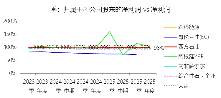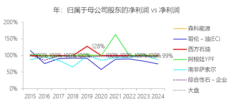 归属于母公司股东的净利润:2025年,西方石油的归属于母公司股东的净利润为23.26亿美元,同比减少23.89%,与净利润的比例为98.18%,同比下降1.1个百分点;2015-2024年(十年),此项合计为49.19亿美元,平均比例为96.72%,比综合性石油与天然气企业行业的均值低0.48个百分点,长期呈下降趋势。